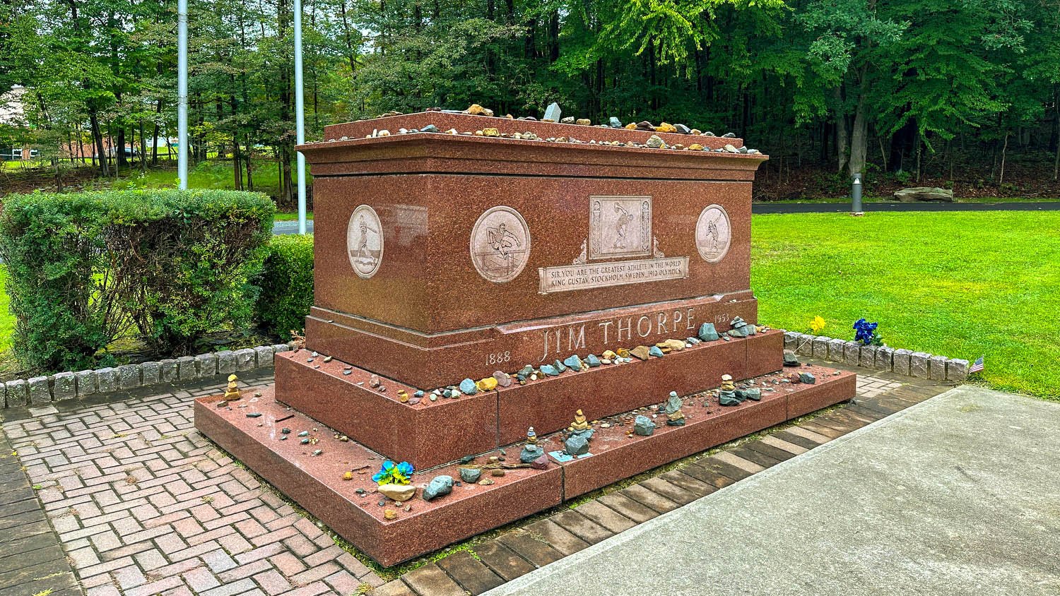 The two cross-river boroughs merged in 1954 and renamed the new municipality Jim Thorpe in his honor, despite Thorpe never setting foot in the Borough while alive. The municipality then obtained the athlete’s remains from his wife and erected a monument to the Oklahoma native, who began his sports career 100 miles (161 kilometers) southwest, as a student at the Carlisle Indian Industrial School in Carlisle, Pennsylvania. The monument site contains his tomb, two statues of him in athletic poses, and historical markers describing his life story. The grave rests on mounds of soil from Thorpe’s native Oklahoma and from the Stockholm Olympic Stadium in which he won his multiple Olympic medals in the Pentathlon and Decathlon .